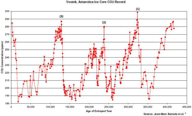 Figure 7.1 – Data extracted from Vostok Ice Core.[3] Number (1) to (3) are the three peak of interglacial warm period. These three data will be used to anticipate the next coming interglacial peak.