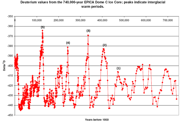 Figure 7.2 – Data extracted from EPICA Dome C Ice Core.[4] number (1) to (5) are the five peaks of interglacial warm period. These five data will be used to anticipate the next coming interglacial peak.