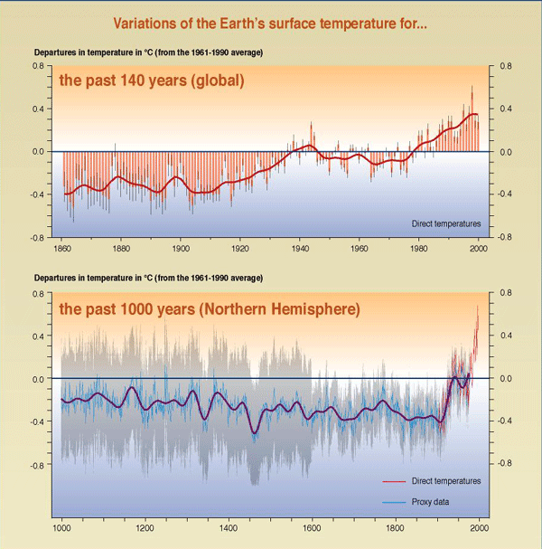 Figure 1.1 shows the temperature rising for the past 140 years (global) and the past 1000 years (Northern Hemisphere) and figure 1.2 shows the global and continental temperature change from 1901 to 2000.