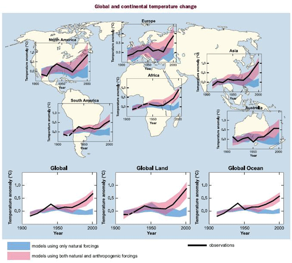 Figure 1.2 - Comparison of observed continental- and global-scale changes in surface temperature with results simulated by climate models using either natural or both natural and anthropogenic forcing. Decadal averages of observations are shown for the period 1906-2005 (black line) plotted against the centre of the decade and relative to the corresponding average for the 1901-1950. Lines are dashed where spatial coverage is less than 50%. Blue shaded bands show the 5 to 95% range for 19 simulations from five climate models using only the natural forcing due to solar activity and volcanoes. Red shaded bands show the 5 to 95% range for 58 simulations from 14 climate models using both natural and anthropogenic forcing.[1]