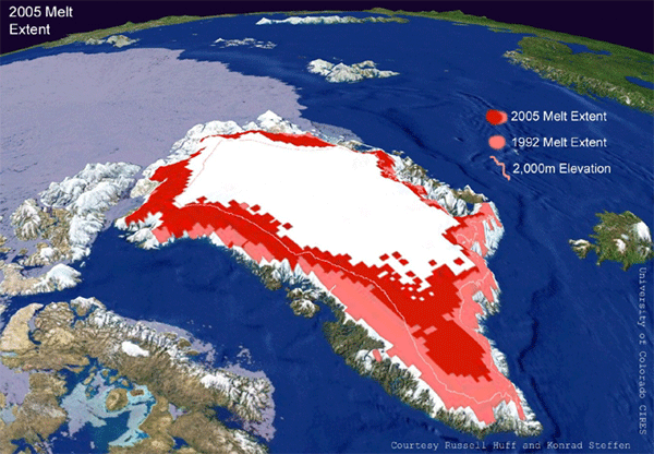 Figure 1.3 - Data gathered by a pair of NASA satellites orbiting Earth show Greenland continued to lose ice mass at a significant rate through April 2006, and that the rate of loss is accelerating, according to a new University of Colorado at Boulder study. The study indicates that from April 2004 to April 2006, Greenland was shedding ice at about two and one-half times the rate of the previous two-year period.