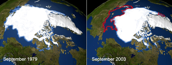 Figure 1.4 - The ice in the North Pole has shrunk for the fourth year in a row, to "the lowest extent of ice cover for more than a century". This is according to scientists from the National Snow and Ice Data Center (NSIDC), Boulder, Colorado. They also warned that "the shrinkage could lead to even faster melting in coming years." The data shows that since 1978 the artic ice has lost 2 million square kilometers to the current are of 5.35 sq km.