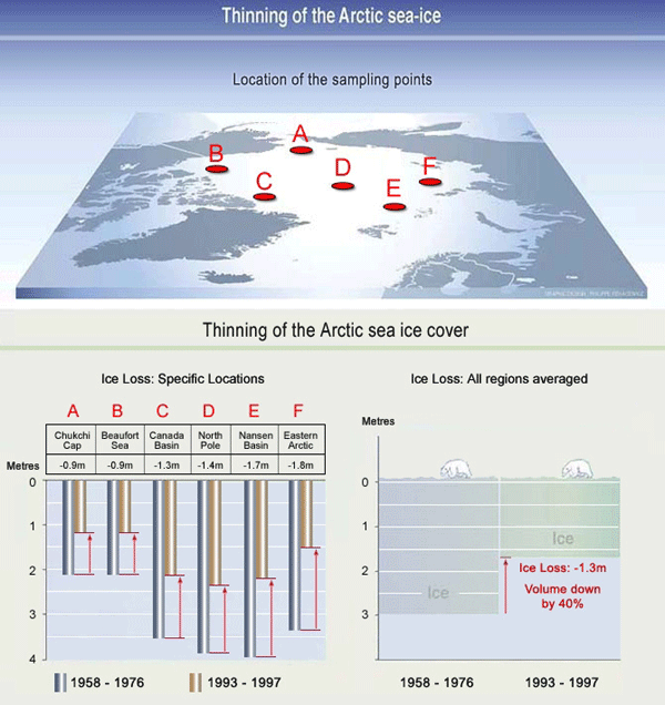 Figure 1.5 - Since 1958, submarines have been patrolling the North Pole. During each voyage, submarine crews measure the thickness of the sea-ice draft. Scientists have evaluated this data and it shows that in the last 30 years, the average ‘draft’ or depth of the ice has decreased 40% (1.3 meters).