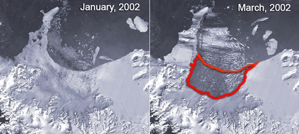 Figure 1.6 - The University of Colorado's National Snow and Ice Data Center using satellite imagery "revealed that the northern section of the Larsen B ice shelf, a large floating ice mass on the eastern side of the Antarctic Peninsula, has shattered and separated from the continent. The shattered ice formed a plume of thousands of icebergs adrift in the Weddell Sea. A total of about 3,250 km2 of shelf area disintegrated in a 35-day period beginning on 31 January 2002. Over the last five years, the shelf has lost a total of 5,700 km2, and is now about 40 percent the size of its previous minimum stable extent."