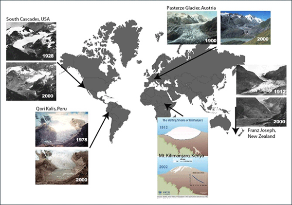 Due to the temperature rise, the ices and glaciers are melting. Figures 1.3 to 1.7 show the pictures of ices and glaciers melting since year 1970 until 2005.[21]