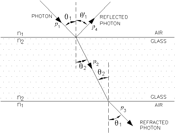 The photon momentum before entering in to glass medium is p1. The reflected portion of photon possesses momentum p4. The refracted portion of photon in glass medium possesses momentum p2 and the final refracted photon to air medium possesses momentum p3.