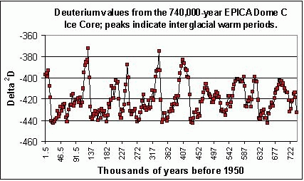 Figure 2.1 – The EPICA Come C Ice Core data shows the historical record of Deuterium back to 740,000 years before present. Each peak indicates the interglacial warm period.